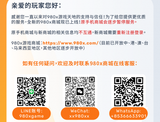 感谢您一直以来对980x游戏天地的支持与信任!为了给您提供更优质的服务,全新的980x商城现已上线!原手机商城会逐步暂停服务。